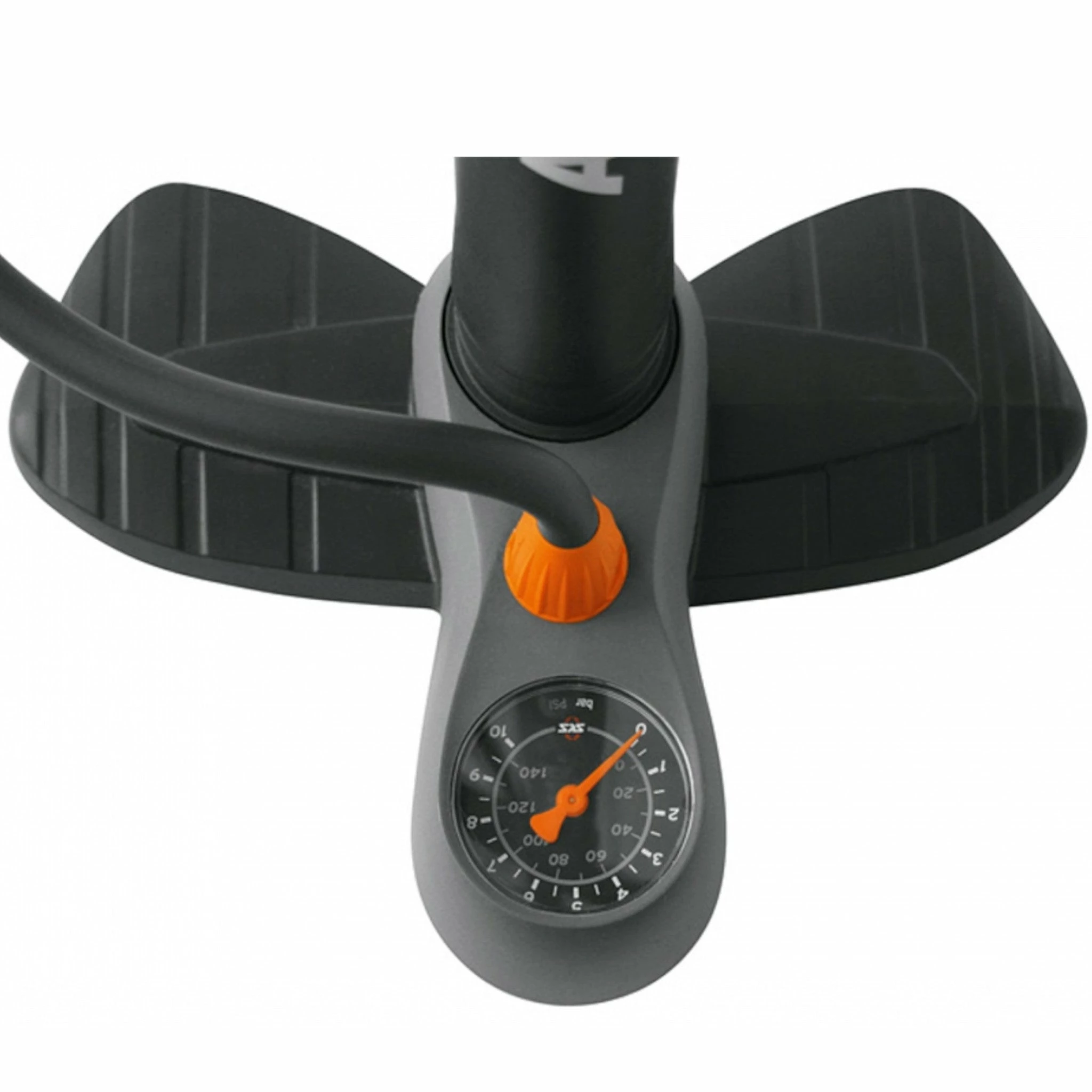 Pompe à pied trivalve compatible avec valves Presta, Schrader et Dunlop équipée d’un manomètre pour mesurer la pression de gonflage en bar et en psi.