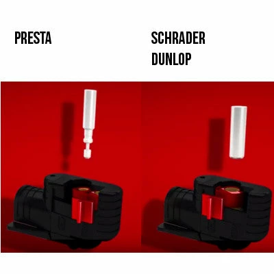 Cette pompe possède un système de raccord ingénieux s’adaptant de façon simple et rapide à la valve, par glissement d’un curseur. Elle est ainsi compatible avec les valves Schrader, Presta et Dunlop.