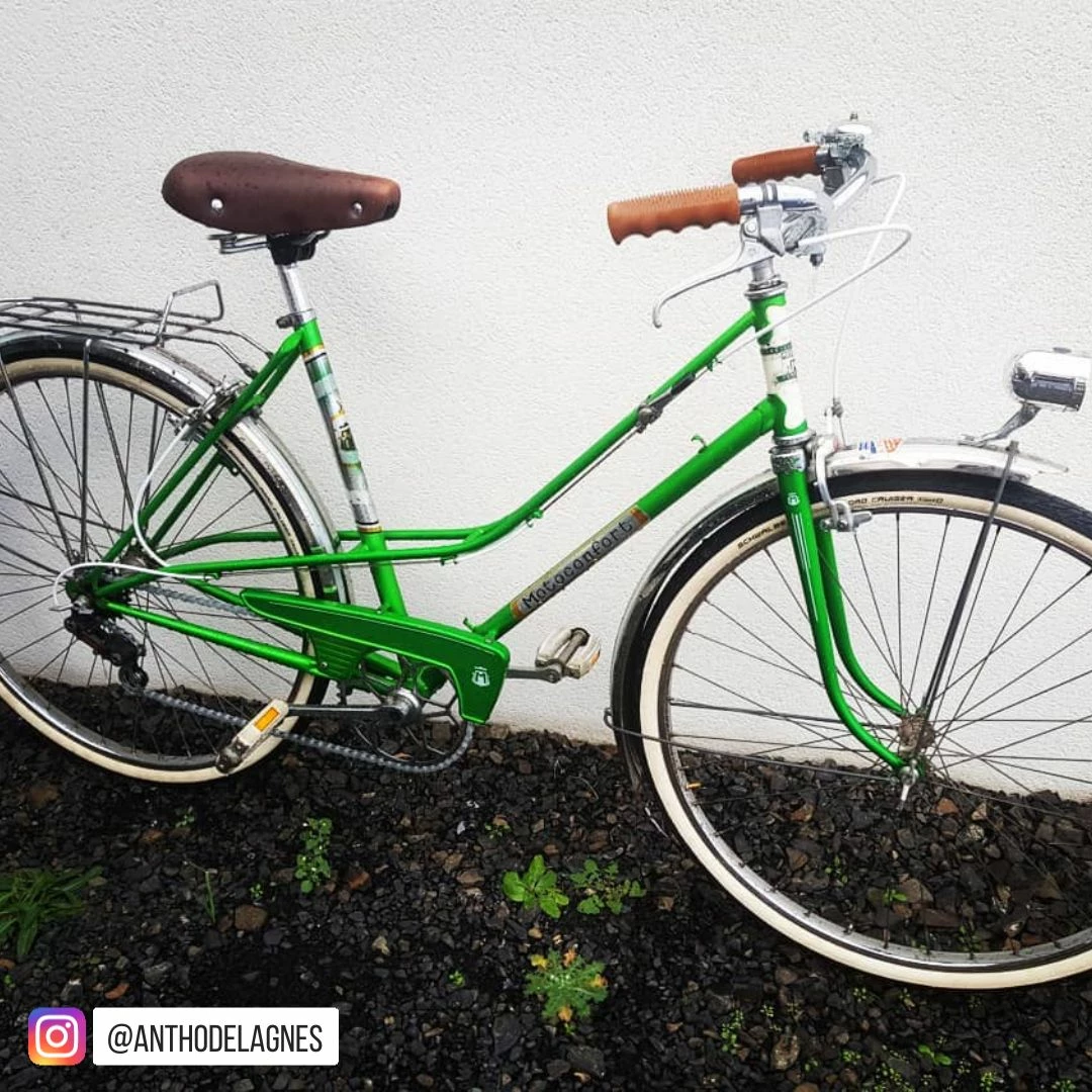 Avec sa couleur marron et son revêtement en imitation cuir, l’équipement donne au vélo un look vintage. La selle est composée de rivets de couleur argent sur l’arrière de l’assise.